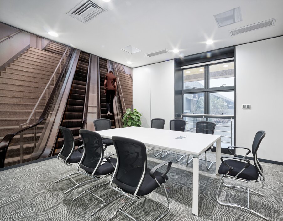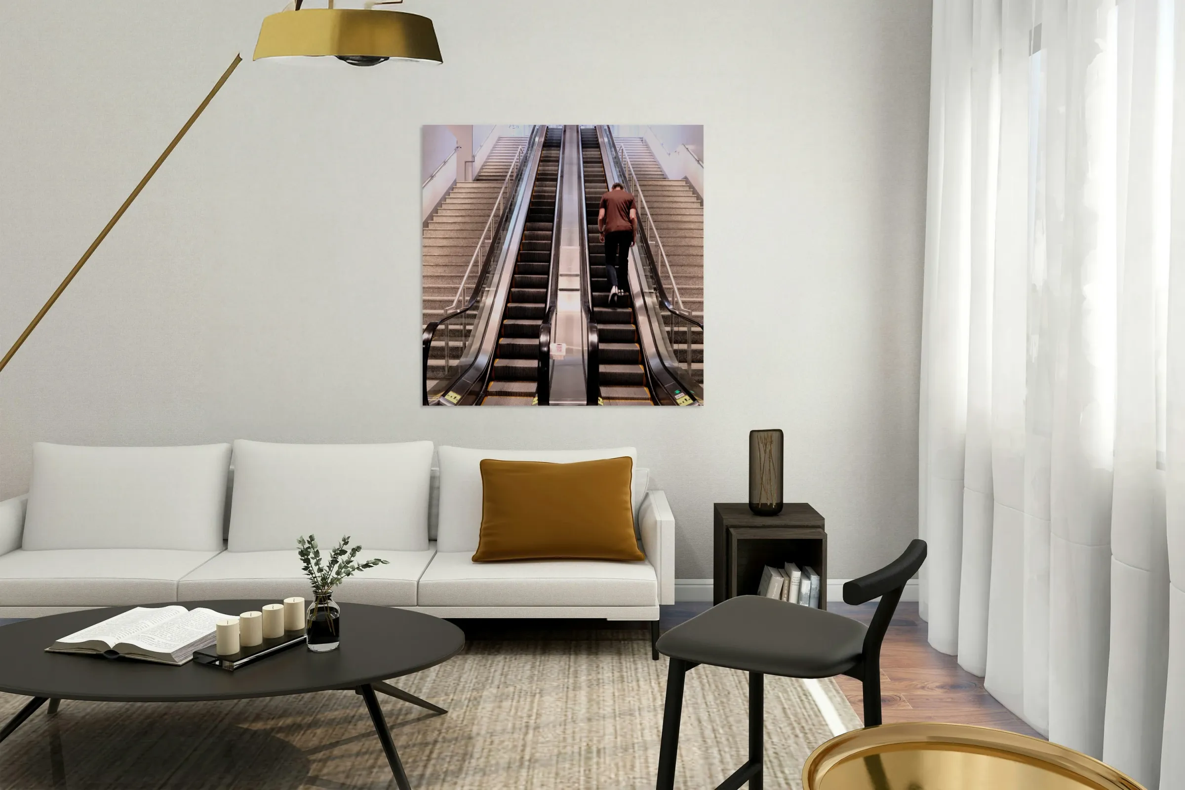 Glass rails gleam like wings, Ascending without motion, The climb feels endless.