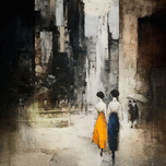 Gold and blue divide, Yet walk as one through the haze— Past and present blend.