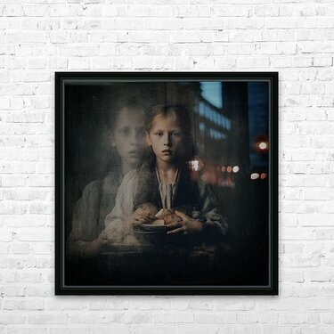 Two faces share one gaze, One fading into smoke and time— A child stares past now.