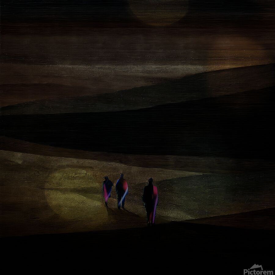 Three shapes cross the sand, Ahead the dark is unwritten— Hope walks without maps.