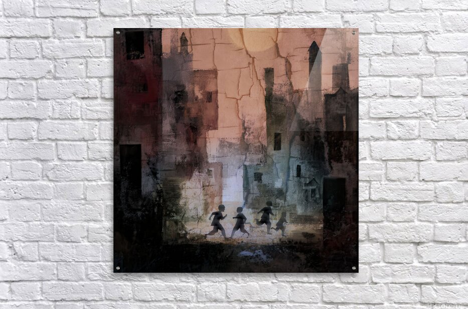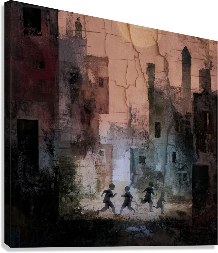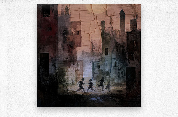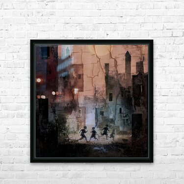 Children cross the dusk Cracked towers hold their shadows— Laughter lights the stone Human structures crack; the human spirit still runs.